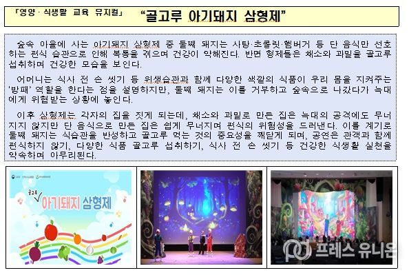 참고로 교육부는 현장소통단의 의견을 수렴하여, 2024년부터 유아의 눈높이에 맞춘 교육용 뮤지컬을 개발해 찾아가는 공연 사업을 추진하고 있다. 올해도 식문화 이해와 긍정적인 식습관 형성을 주제로 하는 새로운 뮤지컬을 개발하여 현장 교육을 지원할 계획이다.