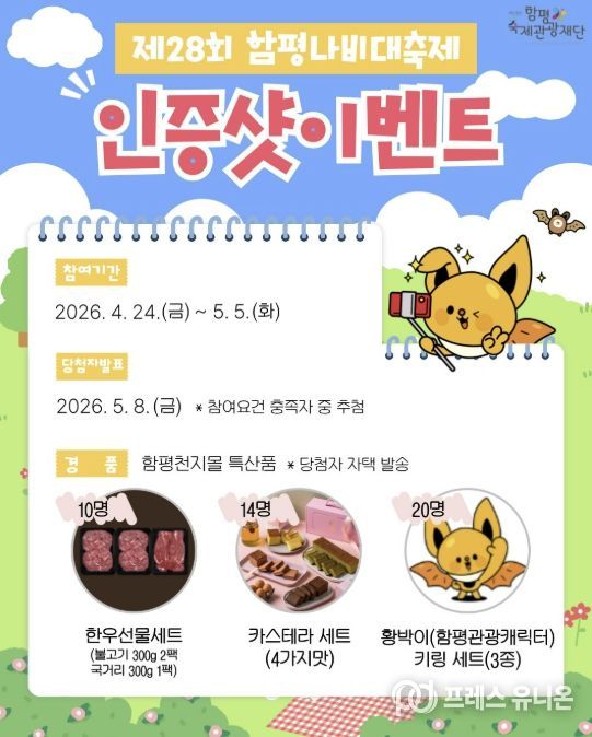 프레스유니온 강찬희 기자 | 전남 함평군이 제28회 함평나비대축제를 맞아 축제의 생생한 현장 분위기를 알리고 관람객의 참여를 확대하기 위해 SNS 인증 이벤트를 진행한다.