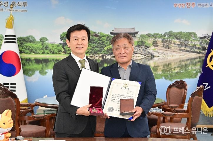 프레스유니온 강찬희 기자 | 진주시는 21일 6·25전쟁 참전 유공자인 ‘고(故) 김경한 상병’의 유족인 조카 김동식 씨에게 화랑무공훈장을 전수했다고 밝혔다.