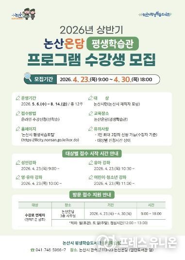 프레스유니온 강찬희 기자 | 논산시가 4월 23일부터 4월 30일까지 ‘2026년 논산시평생학습도서관 상반기 정규 프로그램’수강생을 모집한다.