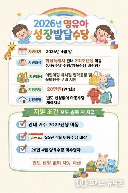 프레스유니온 강찬희 기자 | 화성특례시는 어린이집 및 유치원 입학 초기 영유아 가정의 양육 부담을 덜고 아동의 건강한 성장을 지원하기 위해 ‘2026년 영유아 성장발달수당’을 지급한다고 밝혔다.