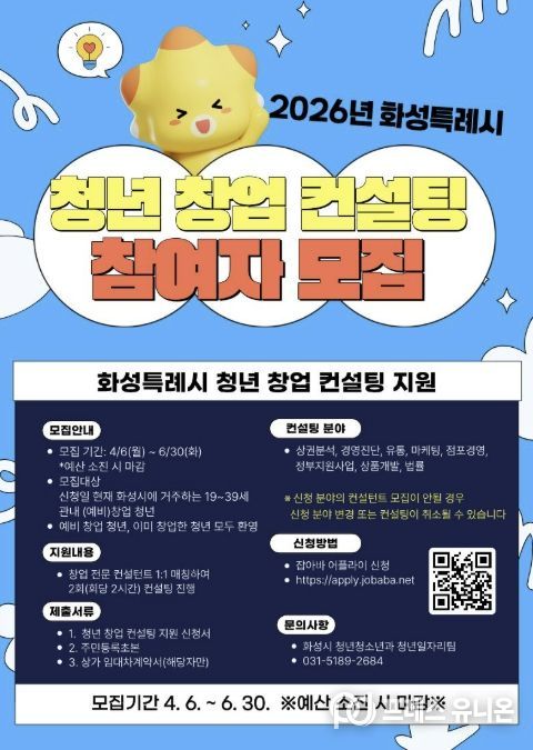 프레스유니온 김성길 기자 | 화성특례시는 오는 6월 30일까지 ‘2026년 청년 창업 컨설팅 지원사업’ 참여자를 모집한다.