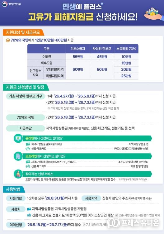지원금의 사용 기한은 8월 31일까지며, 신청은 온·오프라인 모두 가능하다.