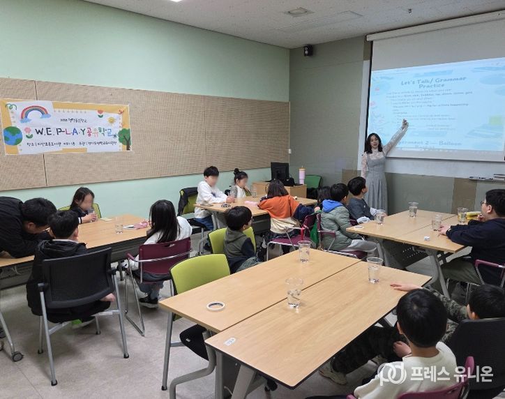 ‘W.E. P-LAY학교(Wake up! English!)’는 영어 회화 능력 향상 및 문화교류를 목적으로 기획된 체험형 프로그램으로, 미공군 가족 자원봉사자와 함께하는 활동 중심 수업으로 구성됐다.