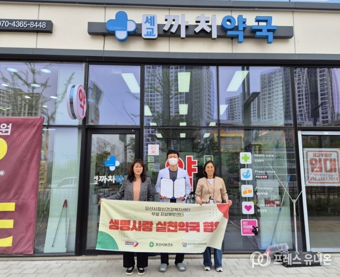 프레스유니온 김성길 기자 | 오산시정신건강복지센터 부설 자살예방센터는 지역사회 기반 생명존중 문화 확산과 자살예방 체계 강화를 위해 지난 20일과 21일 이틀간 관내 약국 4곳과 ‘생명사랑약국’ 업무협약을 체결했다고 밝혔다.