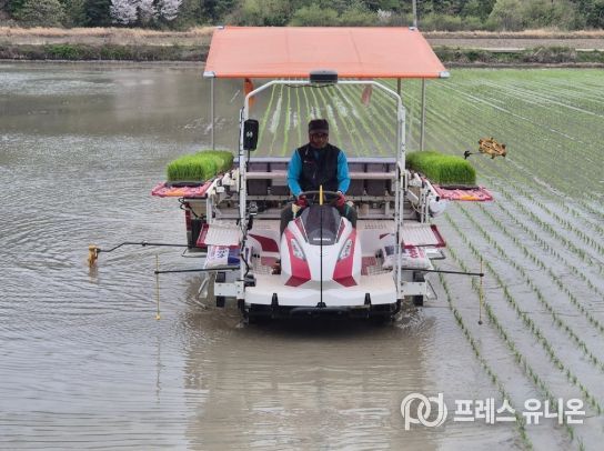 프레스유니온 강찬희 기자 | 신안군은 지역 특성에 맞는 조생종 벼 품종 선발과 최적 이앙시기 확립을 위해 지난 20일 자은면 2ha 규모 실증포장에서 첫 모내기 작업을 실시했다.