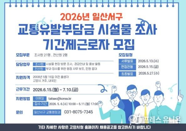 프레스유니온 김성길 기자 | 고양특례시 일산서구는 ‘2026년 교통유발부담금 시설물 전수조사’ 실시를 위해 오는 5월 6일부터 보조원 23명을 모집한다.
