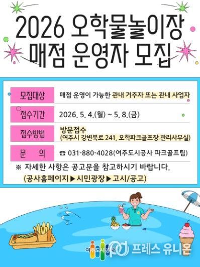 프레스유니온 김성길 기자 | 여주도시공사는 2026년 오학물놀이장 운영을 앞두고 이용객 편의 제공을 위한 매점 운영자를 공개 모집한다고 밝혔다.