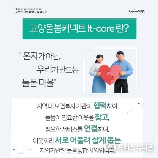 프레스유니온 김성길 기자 | 고양시흰돌종합사회복지관은 일상 속 돌봄을 실현하기 위해 보건-복지가 연계된 통합돌봄 인프라 구축 프로젝트 ‘고양돌봄커넥트 It-care’ 사업을 추진한다고 22일 밝혔다.