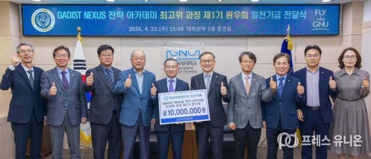 프레스유니온 강찬희 기자 | 경상국립대학교는 4월 22일 오전 11시 대학본부 3층 접견실에서 ‘GADIST NEXUS 전략 아카데미 최고위 과정’ 제1기 원우회의 대학발전기금 전달식을 개최했다.