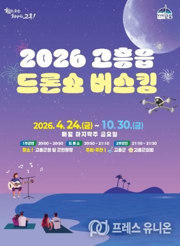프레스유니온 강찬희 기자 | 고흥군은 ‘2026 고흥읍 드론쇼 버스킹 공연’을 오는 4월 24일부터 10월 24일까지 7개월간 매월 마지막 주 금요일 고흥군청 앞 군민광장에서 개최한다고 밝혔다.