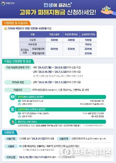 한편 장재혁 합천군수 권한대행은 “고유가 피해지원금 사용기한(2026.8.31.까지)과 경남도민 생활지원금 사용기한(2026.7.31.까지)이 상이함에 따라 군민들이 사용에 혼선이 없도록 당부드린다”며 “모든 군민이 빠짐없이 지원을 받을 수 있도록 업무 추진에 만전을 기하겠다”고 밝혔다.