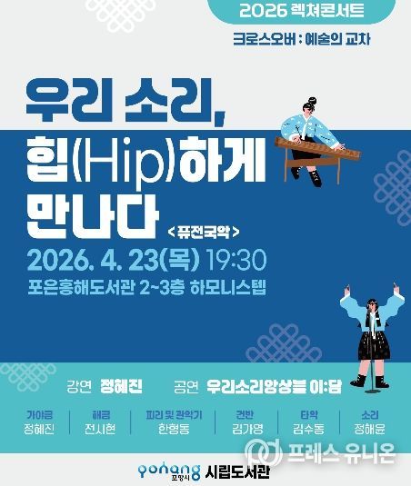 프레스유니온 강찬희 기자 | 포항시는 오는 23일 포은흥해도서관 하모니스텝에서 ‘2026 렉쳐콘서트 - 크로스 오버 : 예술의 교차’의 첫 시간 ‘우리 소리, 힙(Hip)하게 만나다’를 운영한다.