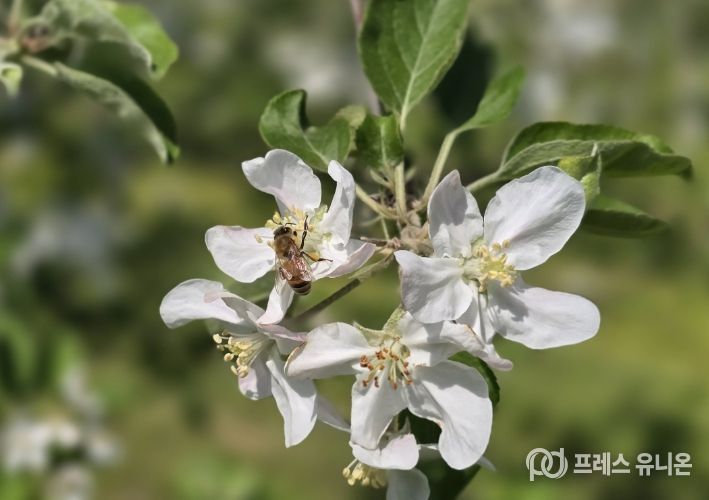 프레스유니온 강찬희 기자 | 포항시 농업기술센터는 본격적인 사과 개화기를 맞아 꿀벌 등 화분매개곤충 보호와 안전한 농산물 생산을 위해 사과 적과제(카바릴수화제) 사용 주의를 당부했다.