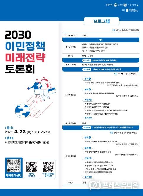 프레스유니온 강찬희 기자 | 법무부는 2026년 4월 22일 오후 2시 서울대학교 행정대학원에서 서울대학교(총장 유홍림)와 공동으로'2030 이민정책 미래전략'토론회를 개최했다.