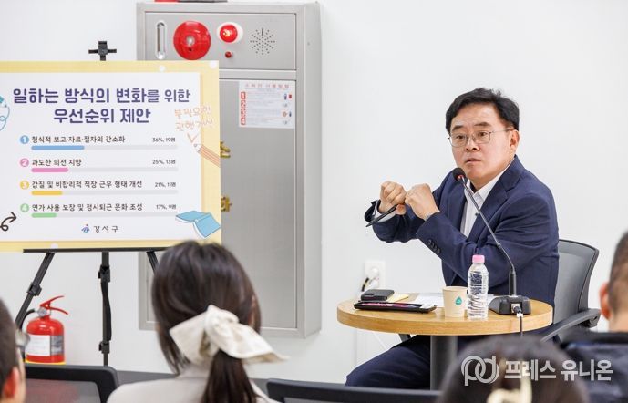 프레스유니온 강찬희 기자 | 진교훈 강서구청장이 22일 수요일 주요 계약‧인허가 등 부패 취약분야 부서 직원들과 청렴 소통 간담회를 가졌다.