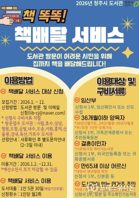 프레스유니온 김성길 기자 | 청주시는 도서관 방문이 어려운 독서 취약계층을 위해 운영 중인 ‘책 똑똑! 책배달 서비스’ 신청자가 600명을 돌파했다고 23일 밝혔다.