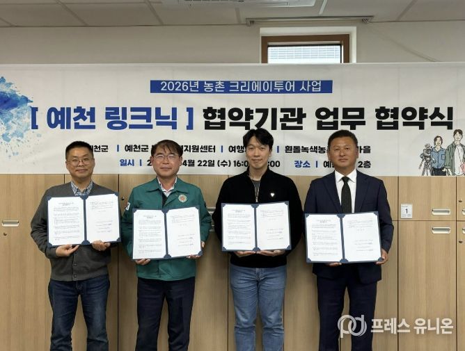 프레스유니온 강찬희 기자 | 예천군은 지난 22일 오후 4시, ‘농촌 크리에이투어’ 사업의 체계적인 추진과 민·관 협력 강화를 위한 민간 협의체를 구성하고 업무 협약을 체결했다고 밝혔다.