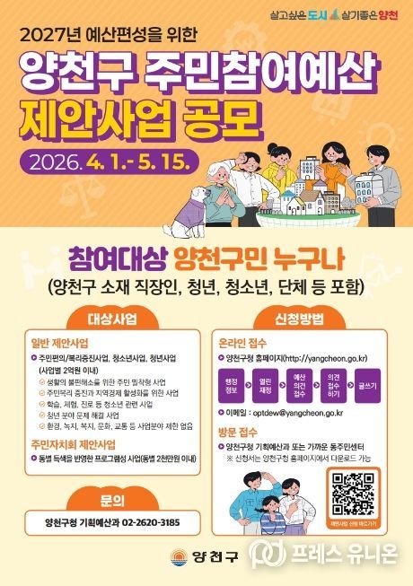 프레스유니온 강찬희 기자 | 양천구는 2027년 예산 편성 과정에 구민의 목소리를 반영하기 위해 ‘주민참여예산 제안사업’ 공모를 오는 5월 15일까지 진행한다고 밝혔다.