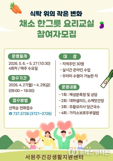 프레스유니온 강찬희 기자 | 서원주건강생활지원센터는 증가하는 만성질환에 대응하기 위한 ‘식탁 위의 작은 변화, 채소 한그릇 요리교실’ 프로그램 참여자를 모집한다.