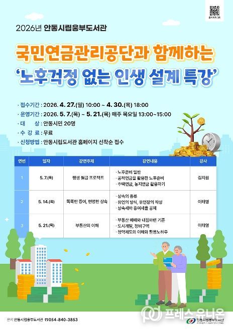 프레스유니온 강찬희 기자 | 안동시립웅부도서관은 지역 주민들에게 건강하고 안정적인 노후생활을 지원하기 위해 부동산, 연금, 상속 등 행복한 노후 설계의 핵심 노하우를 전하는 ‘노후 걱정 없는 인생 설계’ 특강을 운영한다고 23일 밝혔다.