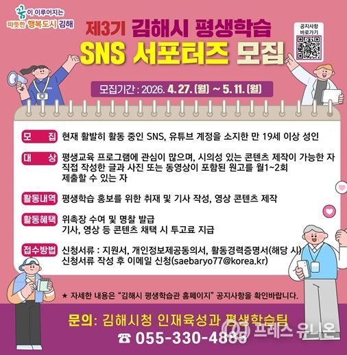 프레스유니온 강찬희 기자 | 김해시는 27일부터 5월 11일까지 제3기 김해시 평생학습 SNS 서포터즈를 모집한다.