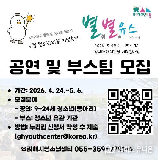 프레스유니온 강찬희 기자 | 김해시청소년센터는 청소년이 직접 기획하고 참여하는 2026년 청소년의 달 기념 축제 ‘별별유스’를 앞두고 공연 및 체험 부스 참가팀 모집에 나섰다고 밝혔다.