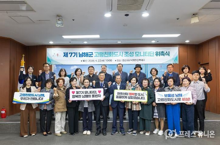 프레스유니온 강찬희 기자 | 남해군은 22일 종합사회복지관 지하 다목적홀에서 제7기 남해군 고령친화도시 조성 모니터단 위촉식 및 역량강화 교육을 개최했다.