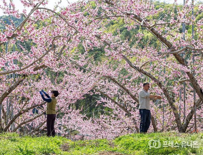 복숭아 재배 과정에서 이뤄지는 ‘꽃 솎기’는 적정한 열매 수를 유지하기 위한 작업으로 과실의 품질을 높이고 안정적인 수확을 돕는 중요한 과정이다.