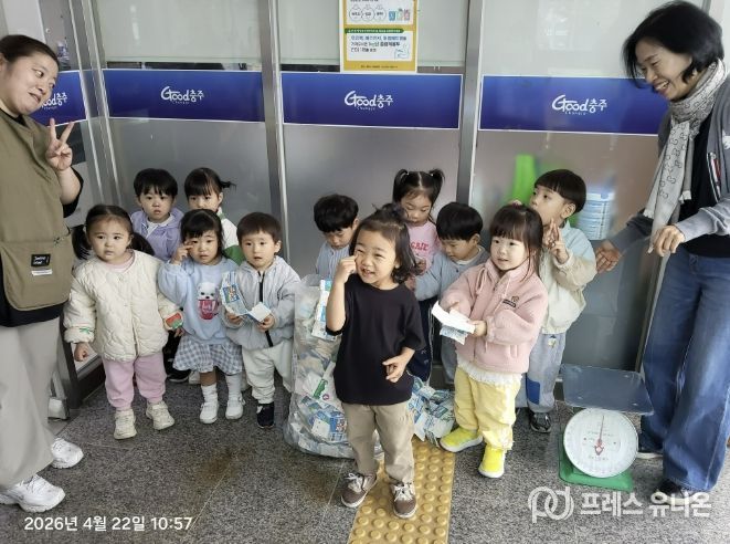 프레스유니온 김성길 기자 | 충주시 대소원면 소재 코아키즈어린이집 원생들이 22일 자원 재순환의 가치를 실천하기 위해 대소원면행정복지센터를 방문했다.