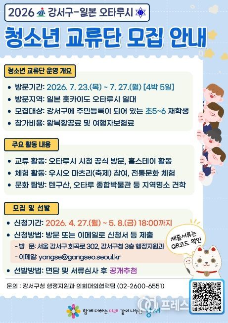 프레스유니온 강찬희 기자 | 서울 강서구는 자매도시인 일본 오타루시와의 우호를 강화하고, 지역 청소년에게 특별한 해외 문화 체험의 기회를 제공하기 위해 ‘강서구-오타루시 청소년 교류단’ 참가자를 모집한다고 밝혔다.