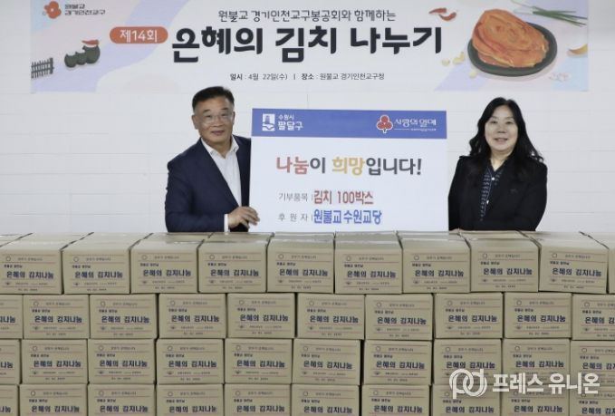 프레스유니온 김성길 기자 | 수원시 팔달구은 원불교 수원교당으로부터 지난 22일, 김치 100박스를 기부받았다고 밝혔다.