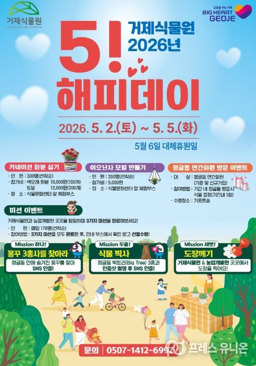 프레스유니온 강찬희 기자 | 거제시농업기술센터는 오는 5월 2일부터 5월 5일까지 거제식물원 일원에서 특별행사 ‘거제식물원 5! 해피데이’를 운영한다고 밝혔다.