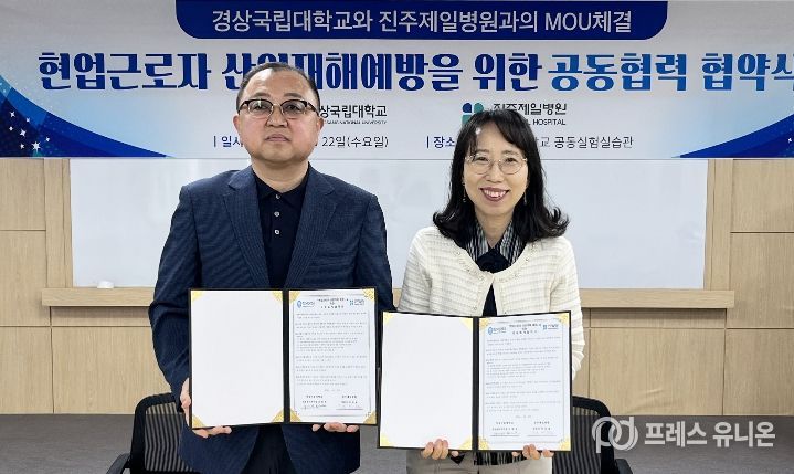 프레스유니온 강찬희 기자 | 경상국립대학교 안전관리본부와 진주제일병원은 4월 22일 가좌캠퍼스 공동실험실습관 2층 세미나실에서 현업근로자 산업재해 예방을 위한 공동협력 협약을 체결했다.