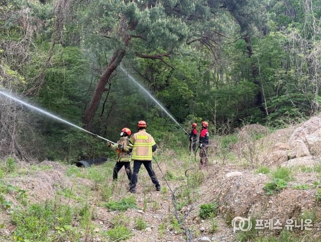 훈련은 산불전문진화대와 산불 진화 가용장비를 모두 투입해 산불 진압 대응 전술을 펼쳤으며 산불 발생에 대비해 실질적 진화 능력을 배양했다.