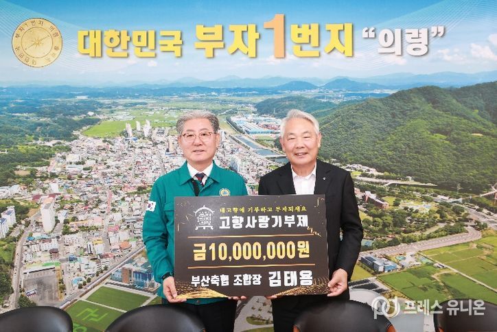 프레스유니온 강찬희 기자 | 의령군은 지난 21일 부산축협 김태용 조합장이 군을 방문해 고향사랑기부금 1,000만 원을 기탁했다고 밝혔다.