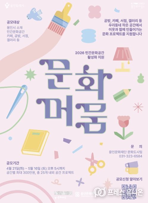 프레스유니온 김성길 기자 | 용인문화재단은 오는 5월 16일까지 ‘민간문화공간 활성화 지원사업 '문화머뭄'’의 참여 공간을 모집한다고 밝혔다. 지난해 25개소 공간에서 203회의 프로그램을 운영하며 2,101명의 시민 참여를 이끌어낸 ‘문화머뭄’ 사업은 올해 재단 자체 재원을 매칭하여 총 25개소의 민간문화공간을 선정하고, 공간별 최대 300만 원까지 프로젝트 운영비를 지원할 예정이다.