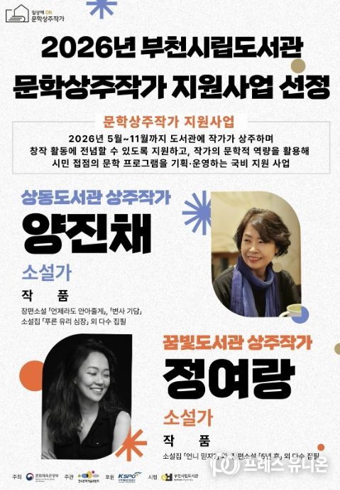 프레스유니온 김성길 기자 | 부천시립상동도서관과 꿈빛도서관은 문화체육관광부가 주관하고 한국문화예술위원회가 주최하는 ‘2026년 도서관 상주작가 지원사업’ 공모에 선정돼 5월부터 시민 대상 문학 프로그램을 운영한다.