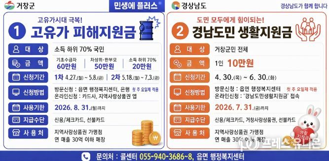 프레스유니온 강찬희 기자 | 거창군은 장기화되고 있는 고유가와 경제침체에 어려움을 겪는 군민들의 생활안정을 위해 ‘고유가 피해지원금’과 ‘경남도민 생활지원금’을 지급한다.