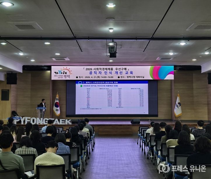 프레스유니온 김성길 기자 | 평택시는 지난 21일 평택시청 대회의실에서 평택시 및 산하 공공기관 구매담당자 100여 명을 대상으로 사회적경제기업 제품 우선구매 활성화를 위한 공공구매 담당자 인식개선 교육을 진행했다.