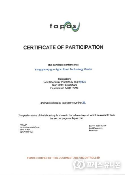 프레스유니온 김성길 기자 | 양평군은 영국 식품환경연구청(FERA)이 주관한 ‘2026년 잔류농약 국제비교숙련도 평가’에서 최고 수준의 분석능력을 인정받아 3년 연속 우수성을 입증했다고 21일 밝혔다.