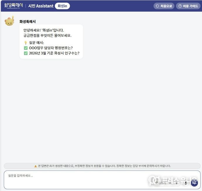 프레스유니온 김성길 기자 | 화성특례시는 시민 체감형 행정서비스 강화를 위해 23일부터 ChatGPT 기반 대화형 AI 검색 서비스 ‘화성in’을 정식 운영한다.
