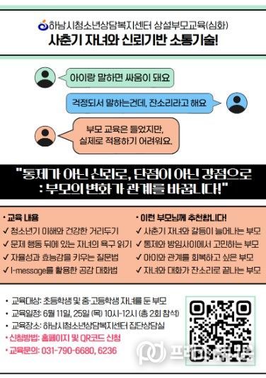 프레스유니온 김성길 기자 | 하남시 청소년상담 복지센터가 부모와 자녀 간 소통을 돕기 위한 부모교육 프로그램을 한층 강화한다. 특히 청소년기 자녀와의 대화에 어려움을 느끼는 부모들이 실제로 체감할 수 있는 교육으로 개편한 것이 특징이다.