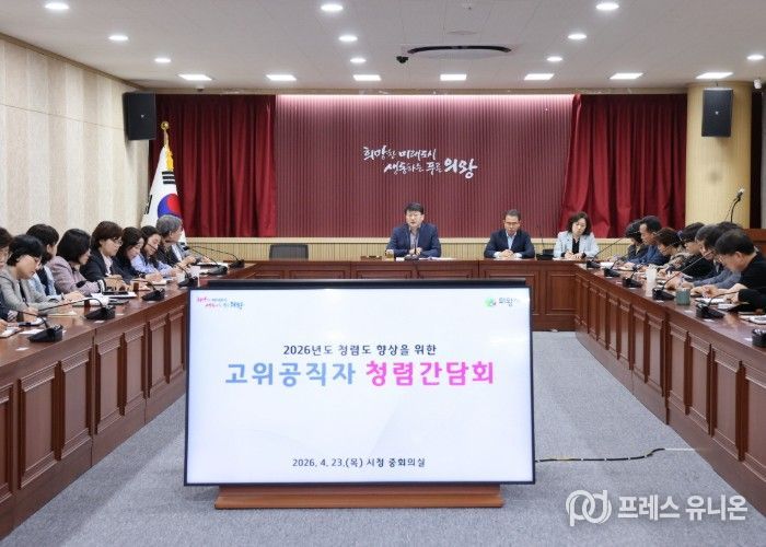 프레스유니온 김성길 기자 | 의왕시가 4월 23일 시청 중회의실에서 고위공직자를 대상으로 청렴간담회를 개최하고, 청렴도 향상을 위한 정책 추진 기반 마련에 나섰다.