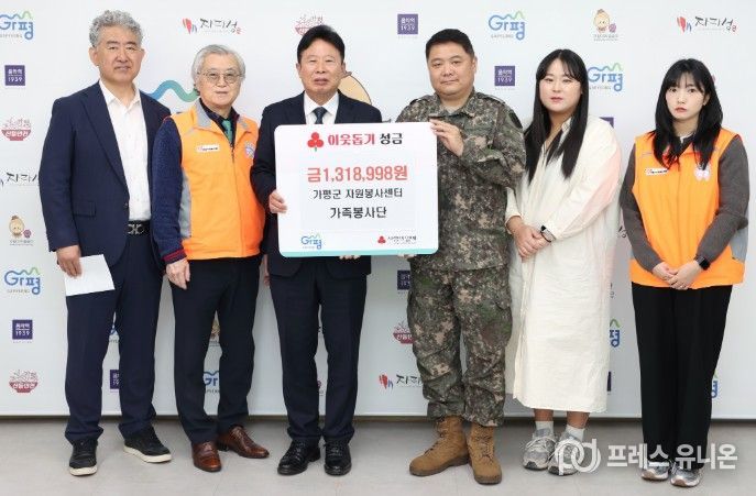 프레스유니온 김성길 기자 | 가평군자원봉사센터는 4월 23일 오전 10시 가평군청 군수실에서 센터가 운영하는 가족봉사단과 함께 이웃돕기 성금을 전달했다.