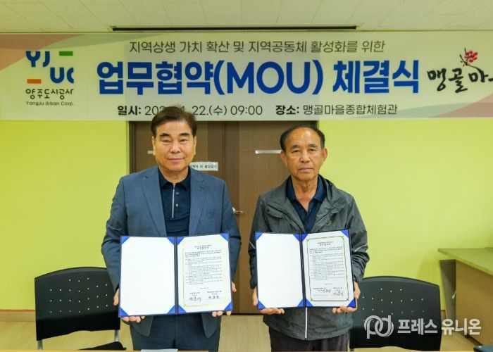 프레스유니온 김성길 기자 | 양주도시공사는 지난 22일 양주시 남면 맹골마을에서 농촌일손돕기 자원봉사활동을 실시하고, 맹골마을영농조합법인과 지역상생을 위한 업무협약을 체결했다고 밝혔다.