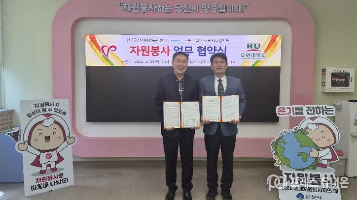 프레스유니온 강찬희 기자 | (사)군산시자원봉사센터(이사장 황진)는 4월 23일 군산시자원봉사센터 세미나실에서 호원대학교 호원사회봉사단(단장 서충길)과 지역사회 연계 봉사활동 활성화를 위한 업무협약(MOU)을 체결했다.