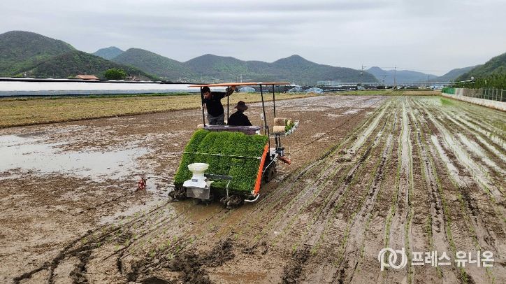 프레스유니온 강찬희 기자 | 경남 밀양시는 지난 21일부터 23일까지 3일간 상동면 안인리 일원 3ha 규모 논에서 2026년 벼농사의 시작을 알리는 첫 모내기를 실시했다고 밝혔다.