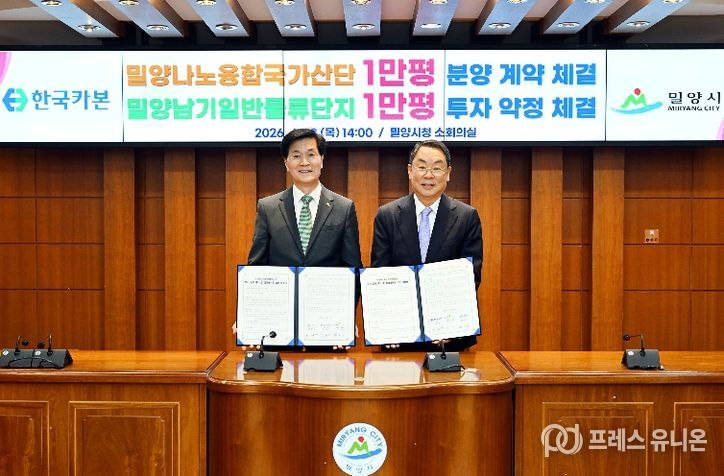 프레스유니온 강찬희 기자 | 경남 밀양시는 23일 시청 소회의실에서 ㈜한국카본, 한국토지주택공사 경남지역본부와 함께 ‘밀양나노융합국가산업단지 부지분양 계약 및 밀양남기일반물류단지 투자약정’을 체결했다.