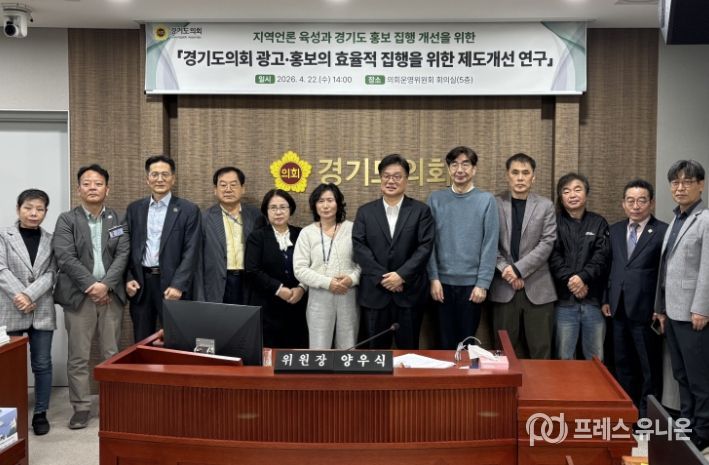 프레스유니온 강찬희 기자 | 경기도의회 의회운영연구회(위원장 양우식)는 지난 22일 의회운영위원회 회의실에서 '경기도의회 광고·홍보의 효율적 집행을 위한 제도개선 연구' 용역 중간보고회를 개최했다.